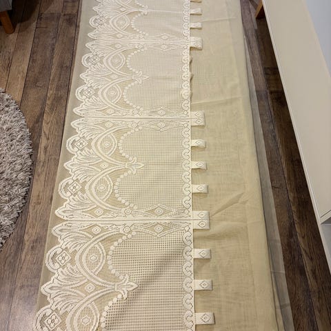 Marjapuuron värinen verho tai kappa. Pituus 1,50 m, leveys 1,8 m