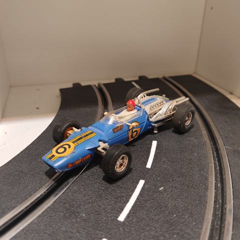Vintage Scalextric Matra Vee autorata auto. Tuulilasin toinen reuna korjattu. Takaripustus/pakoputisto puuttuu. Kokoluokka 1:32 eli sopii yleisimmille autoradoille mm. Scalextric, Carrera, SCX, Ninco, Polistil, Fleischmann yms. Nouto tai postitus +9€.