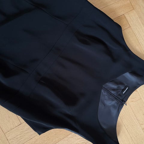 Uuden veroinen Gerry Weber syvän musta juhlapuku, naisten koko 46. Vuorillisessa mekossa on kauniit leikkaukset ja takana vetoketju. Materiaali: päällikangas 100%polyesteri, vuori 100%asetaatti. Materiaali on hengittävä, helppohoitoinen ja rypistymätön.