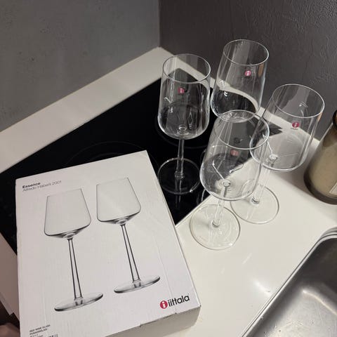 Lähes käyttämättömät Iittala Essence viinilasit. Yhdestä lasista puuttuu tarra.