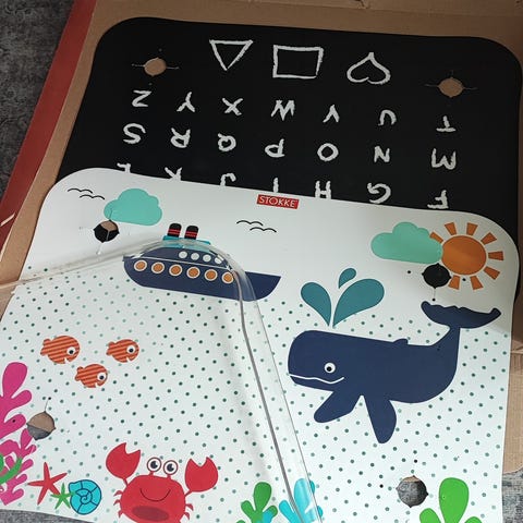 Stokle table top alusta kiinnikkeiden ja kolme kaksipuolista alustaa, joita voi vaihtaa muovialustan alle. Pysyy hyvin pöydässä kiinni ja helppo pyyhkiä.