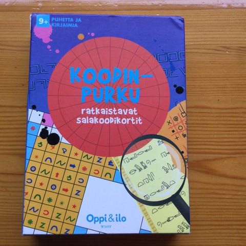Koodin purku ratkaistavat salakoodikortit 50 kpl. Yli 9-vuotiaille. Tussi puuttuu, mutta niitä voi ostaa. Pärjää ilman tussiakin.
