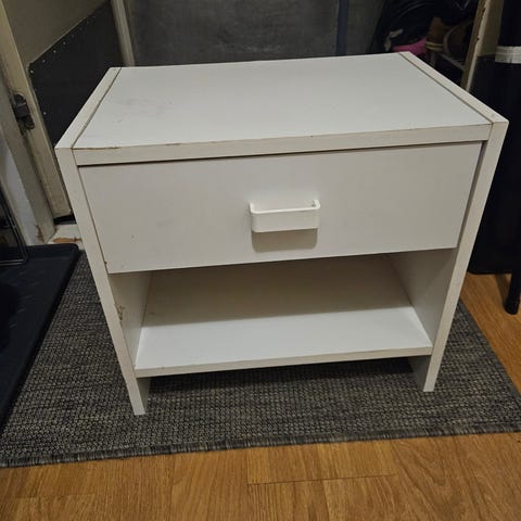 Kaksi samanlaista valkoiseksi maalattua yöpöytää.