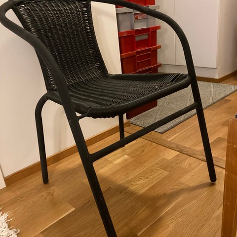 Musta taittuva tuoli, jonka selkänojassa muutamia elämän jälkiä.