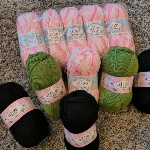 1 kerä hieman eri sävyinen vihreä 95 g, vyöte meni roskiin.