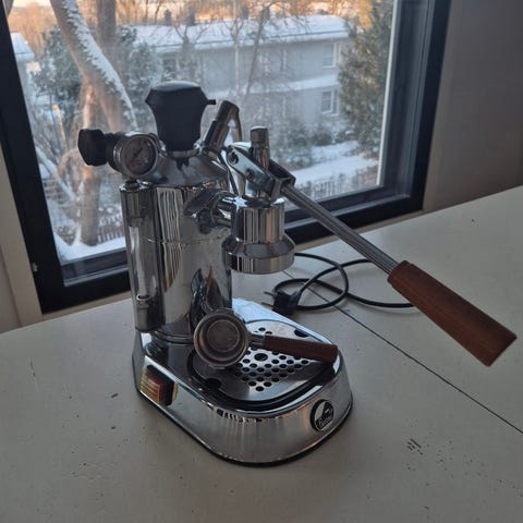 La Pavoni Professonal kahvikone ruostumattomasta teräksestä. Käytetään espresson valmistukseen manuaalisella vivulla. Kompakti koko, sopii kotikäyttöön tai pieniin tiloihin. Hinta uutena 710 €