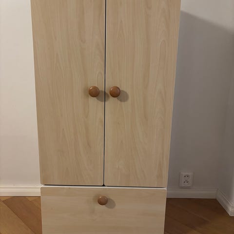 Myydään IKEA Småstad -vaatekaappi. Oven avausnupit ovat irronneet, joten pitää korvata uusilla.