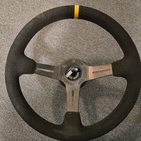 Asiallisessa käyttökunnossa oleva ratti, sisältää vaihdeläpät, napit ja niiden ohjainlaitteen. Pieniä jälkiä voi tarkasti katsomalla löytää, mutta yleisilme siisti. Ei sisällä airbagia.