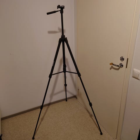 Jalat ja keskimasto alumiinia, muovirunko. Made in Germany tuote. Kaikki säädöt ja kiristyssäädöt pelaa. Ei ihmeemmin käytön jälkiäkään. Mukaan olkahihna. Jos haluat kaksi kolmijalkaa 30€ yhteishintaan niin katso myös toinen ilmoitukseni.