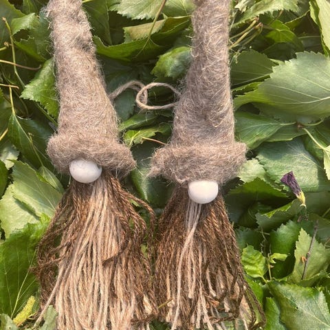 Käsityönä tehtyjä tervantuoksuisia tonttuja. Sellofaanipussiin pakattuna.