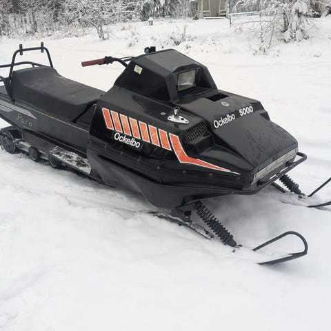 Okkelbo 5000,vanha toimiva työkelkka,ajoon tai osiksi.Kelkka lisähintaan.Pituus n.KAKSI metriä.
