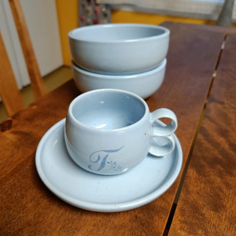 Neljän kulhon lisäksi Pentik Halla maljakko, jonka korkeus on n. 14cm ja suuaukon halkaisija n. 9cm. Maljakko sisällä on haalea rusehtava kasteluveden tahra, joka ei ainakaan ilman tiskiainetta irronnut.