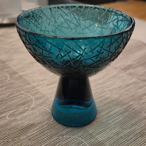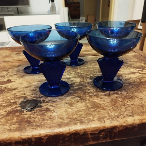 Myydään 5 kpl sinisiä jälkiruokamaljoja, malli Barokki. Design, Erkkitapio Siiroinen, Riihimäen lasi.