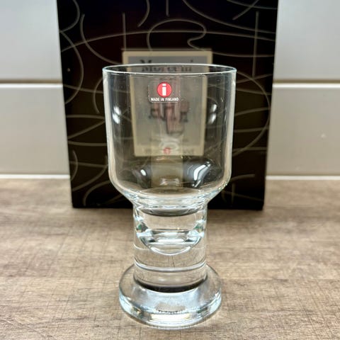 Kaksi kappaletta Heikki Orvolan suunnitteleman Moreeni-sarjan punaviinilaseja alkuperäispakkauksessaan. Lasit ovat käyttämättömiä tai lähes käyttämättömiä. Lasin koko 26 cl.