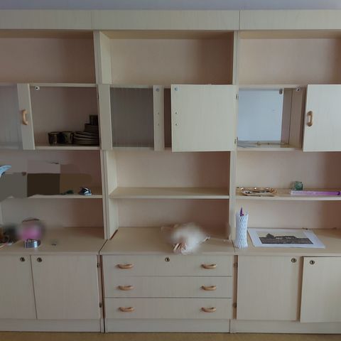 Vitriinihylly, josta ei levyhöttöä löydy, joten on todella painava. Kork. 144, lev. 202, syv. reunoilta 50 ja keskeltä 60, tv-aukon lev. 93,5 cm. Kantamisessa autetaan täällä päässä.