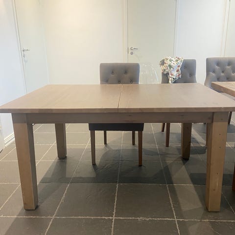 Tukeva rakenteiden ruoka pöytä. 30cm. pidennys pala mukana. Päällystetty vanha laudan kuosisella tapetilla ja lakka päälle.