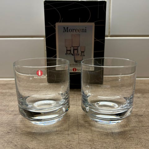 Kaksi kappaletta Heikki Orvolan 1990-luvulla Iittalalle suunnitteleman Moreeni-sarjan olutlaseja alkuperäispakkauksessaan. Lasit ovat käyttämättömiä tai lähes käyttämättömiä. Lasin tilavuus 40 cl.