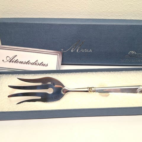 Myydään Musla -sillihaarukka. Leimattu 813 hopea. Kullattu pesä. Pituus noin 15cm. Ostaja kiillottaa.