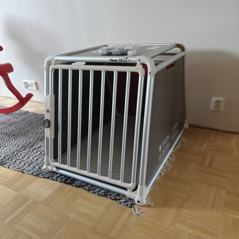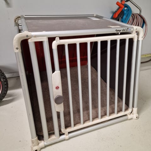 L: korkeus 66 cm, leveys 68 cm, syvyys 93,5 cm, katon syvyys 57 cm. Maksimipaino 45 kg, häkin paino 21,6 kg. Mukaan saa pehmusteet häkin pohjalle. Nouto Vantaa Varisto.