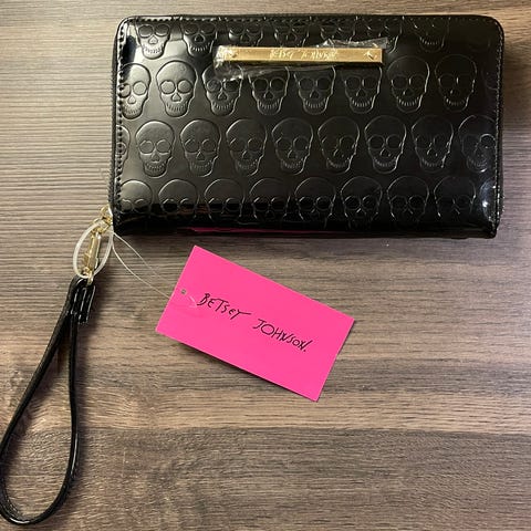 Uusi Betsey Johnson musta nahkainen clutch niiteillä ja röyhelöyksityiskohdilla