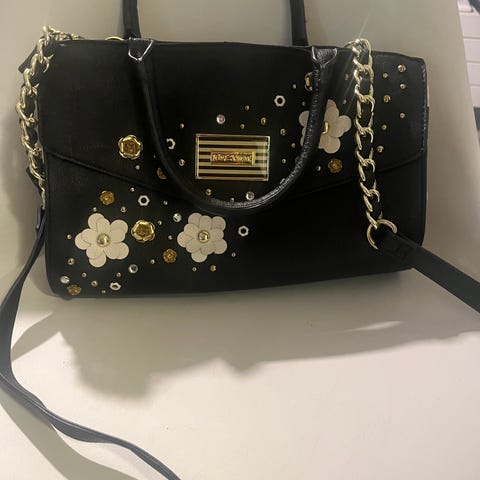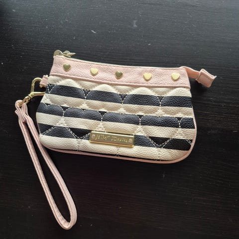 Tyylikäs ja näyttävä Betsey Johnson -clutch valmistettu pehmeästä mustasta nahasta, jossa kullanväriset niittiyksityiskohdat. Täydellinen valinta juhliin tai tuomaan särmää asukokonaisuuteen.