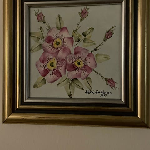 Liituväriyö “Juhannusruusu”, taulun koko 34*44 cm, signeerattu 1984, Iris Asunta.