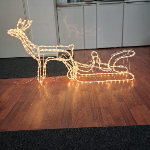 Kaksi poroa ja reki, valoilla, IP44. Porot ovat asennettuna peräkkäin.