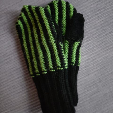 Uudet oranssi/ruskeat siililapaset. Mitat varresta sormen päähän 13cm, varsi 6,5cm. Neulottu Novitan 7 veljestä langasta ja "karvalangasta".