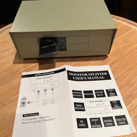 Centronics jakaja kahdelle kirjoittimelle tai muulle. Koko: syvyys 15 cm, leveys 14,5 cm ja korkeus 6 cm. Liittimet: one in ja two out. Voidaan postittaa. Myös toridiilinä.
