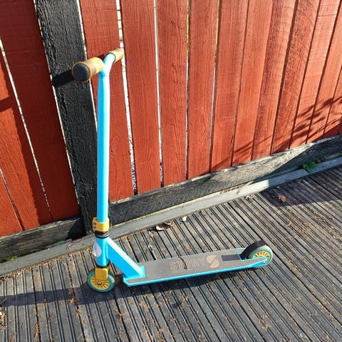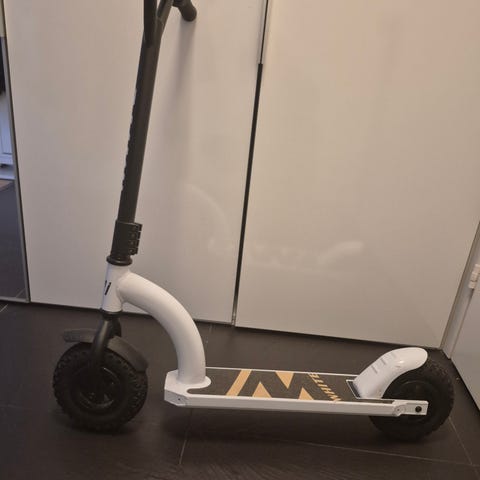 Hyvä temppu skuutti uuteen käyttöön! Tarvitsee uudet käsigripit. Pieni halkeama pohjassa, silti paljon ajamista jäljellä!