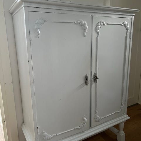 Myynnissä komea, massiivinen vanha kaappi, upealla ovikoristelulla ja pallojaloilla.