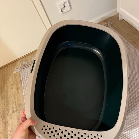 Myyntiin kissasta luopumisen vuoksi 6.9.2025 Mustista ja Mirristä ostettu kissan kulmamallinen hiekkalaatikko. Laatikon koko on 57 x 51 x 22 cm. Tämä tosiaan ehti olla noin kuukauden käytössä ja on hyvässä kunnossa, mutta toki pohjassa on naarmuja kissan kuopsuttamisesta. Mukaan tulee kuvassa näkyvä etumatto ja kaksi hiekkalapiota, joista toinen ihan käyttämätön. Maton koko 45 x 38 cm.