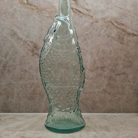 Kiinnostava meriaiheinen pullo, jossa on avaimella käännettävä soittorasiamekanismi, joka alkaa soimaan, kun pullon nostaa pöydältä tai muulta alustalta.