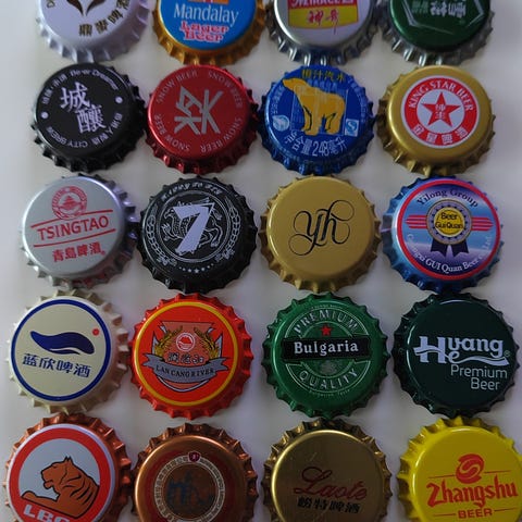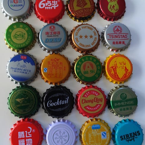 20 kruunukorkkia, tehdasuusia. 19 Kiinasta, yksi Burmasta/Myanmarista. Valtaosa olutkorkkeja, mukana muutama virvoitusjuoma ym.