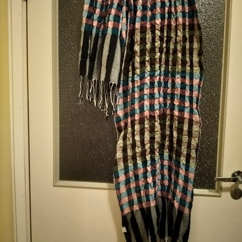 Punainen kaulaliina, joka on toiselta puolelta violetti. Alaosassa kukkakuvio. Paksu ja lämmin.Hyvässä kunnossa.