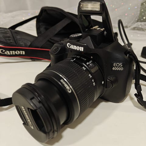 Canon EOS 4000D digitaalinen järjestelmäkamera, varustettu Canon EF-S 18-55mm f/3.5-5.6 objektiivilla. Kamera on musta ja sopii yleiskäyttöön valokuvaukseen. Mukana on akku, laturi, kamerahihna, laukku ja pieni jalusta. Kamera tarjoaa perustoiminnot digitaaliseen valokuvaukseen ja videokuvaukseen. Ollut erittäin vähällä käytöllä. Kameralla on otettu kuvia vain 59kpl.