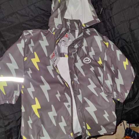 Sininen sadetakki kokoa 98. Vetoketju ja nappilista. Miinuksena vähän pureskeltu kauluslistaa sisäpuolelta, kts kuva. Mustat kurikset ehjät, lahkeiden heijastimet vähän kuluneet. Näissä kokomerkki 110. Vaatteet nimikoitu, nimet sutattu.