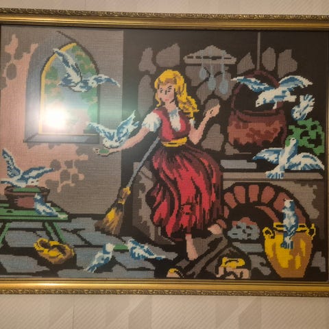 Myydään hieno Tuhkimo ristipistotaulu. Mitat 60x77cm.