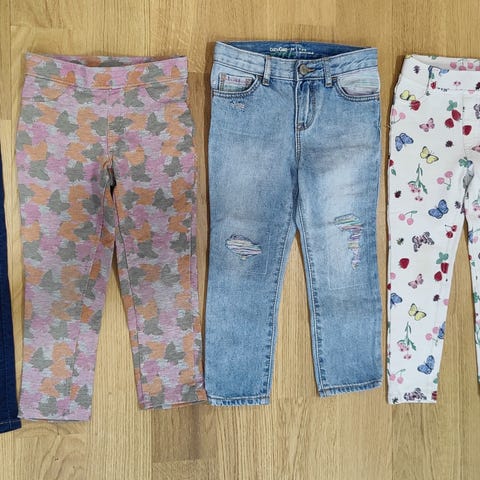 Settinä housuja/farkkuja. Kaikki ehjiä ja käyttökelpoisia, mutta käytettyjä. Osassa enemmän polvissa vaalentumaa/kulumaa ja osassa vähemmän.