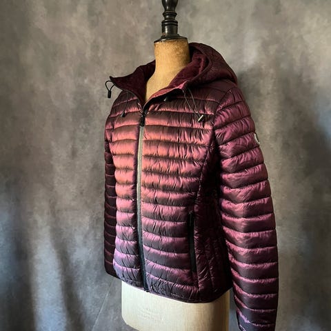Käyttämätön Liu Jon toppatakki, kaunis väri vahva lohenpunainen. Kai-kai 52 cm, pituus olkapäältä 64 cm.