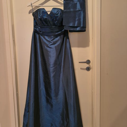 Sininen naisten kaksiosainen iltapuku, koko 36. Puvussa on kirjailtu yläosa ja hameessa pitkä helma, jossa pieni laahusmainen takaosa. Materiaali on kiiltävää ja sopii juhla- tai tilaisuuskäyttöön. Kaunis vaikka vanhojentanssipuvuksi!