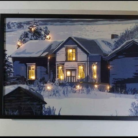 Vallilan kankaasta tehty valotaulu. Valoista ei kunnon kuvaa, kun hohtavat ja tekee niistä keltaisen. Koko 31x60cm.