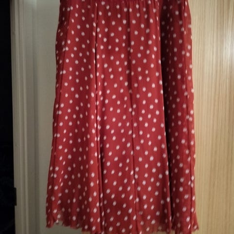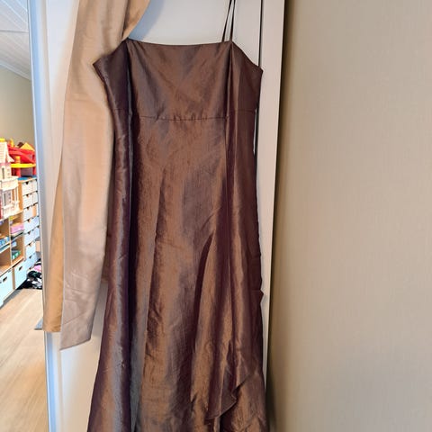 Naisten juhlahame, kaksiosainen, koko 40. Väri kiiltävä ruskea ja "elävä" kangas. Merkki Valerie. Yläosa 55 cm, takana vetoketju ja kiinnitys myös niskan takaa. Yläosassa koko vuori. Hameen pituus 109 cm ja siinä myös ruskea koko vuori. Kangas 100 % polyesteri sekä ylä- että alaosa. Valokuvissa kangas ei pääse oikeuksiinsa, luonnossa kauniin värinen. Vaatetta käytetty vain kerran häissä. Todella hyväkuntoinen, ei mitään likaa eikä kulumia.