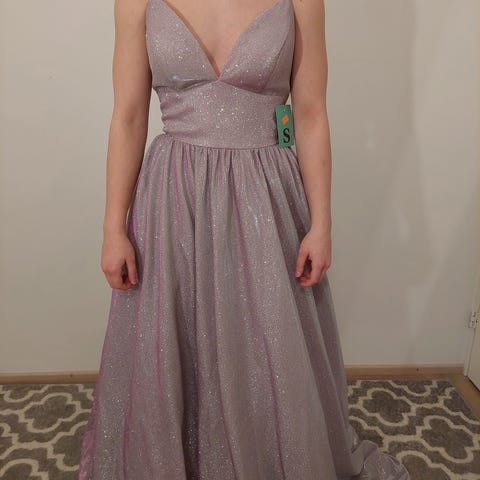 Kerran käytetty vanhojentanssimekko. Väri vaalearoosa ja kankaassa glitteriä. Koko S. Takana nyöritys. Kuvassa 163cm päällä. Mekkoa ei ole lyhennetty ja oli minulle hieman liian pitkä. Hintaan sisältyy mekko ja vannehame
