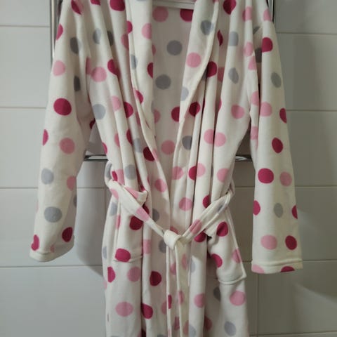 Veluuri aamutakki vetoketjulla. Väri on vähän haalistunut, muuten ehjänä.