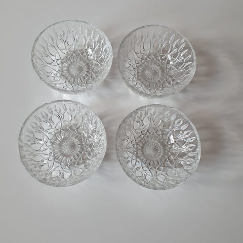 Myydään jalalliset lasiset jälkiruokakulhot (7kpl). Hyvä kunto, ei säröjä.