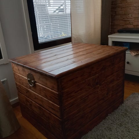 Industrial -tyylinen vanha arkku alkuperäisessä maalissa. Kalustepyörät lisätty alle, helppo liikuttaa. Arkussa paljon säilytystilaa. Erittäin rouhea, maali patinoitunut. Ollut olohuoneen sohvapöytänä.
