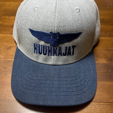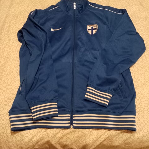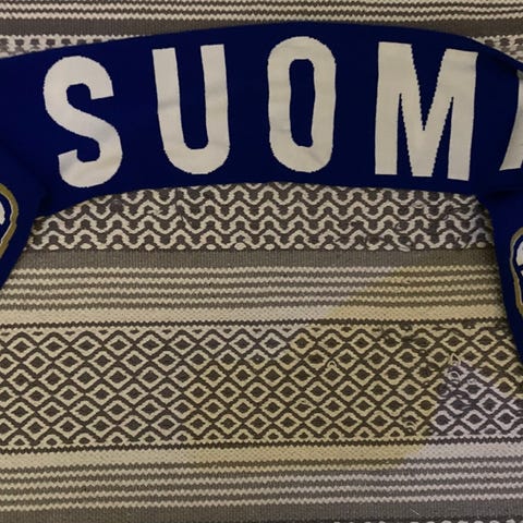 Huuhkajat penaali, jossa on sininen ja musta pöllökuvio ja vetoketju. Mukana jalkapallokenkämuotoinen penaali, jossa on valkoinen, sininen ja musta väri, Suomen lippu ja teksti 'FINLAND'.