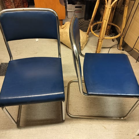 Yrjö Kukkapuron suunnittelemia, Haimin valmistamia 419-mallin tuoleja, 4 ehjää ja yksi rikkinäinen, kaksi ehjää punaista ja kaksi ehjää sinistä ja yksi tuolin muoviosastaan haljennut mutta mahdollisesti liimattavissa oleva punainen tuoli. Suunniteltu ja valmistettu 1970-luvulla. Kaikissa tuolissa on käytön jälkiä ja ajan patinaa, mutta ovat yleisilmeeltään siistejä lukuunottamatta tuota yhtä punaista joka on haljennut istuisosastaan.
