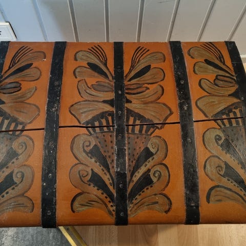 Todella vanha, mutta hyväkuntoinen antiikkiarkku. Rautaiset isot saranat, puunaulat. Korkeus 52 cm, leveys 95 cm ja syvyys 49 cm. Hieman kaareva kansi.